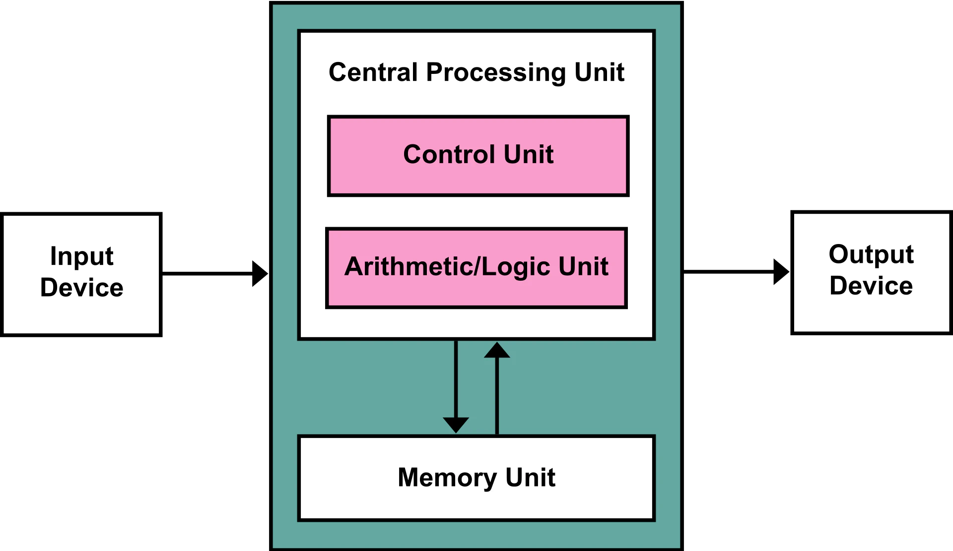 In a Von Neumann machine, like the one depicted above the processing unit is separated from the memory one, which stores both data and instructions. The processor reads the instructions from the memory, decodes them, retrieves the data on which it needs to operate from the same memory and, then, executes the instructions.